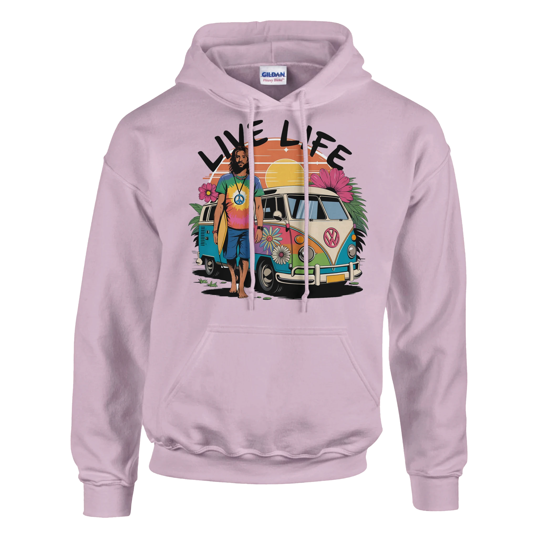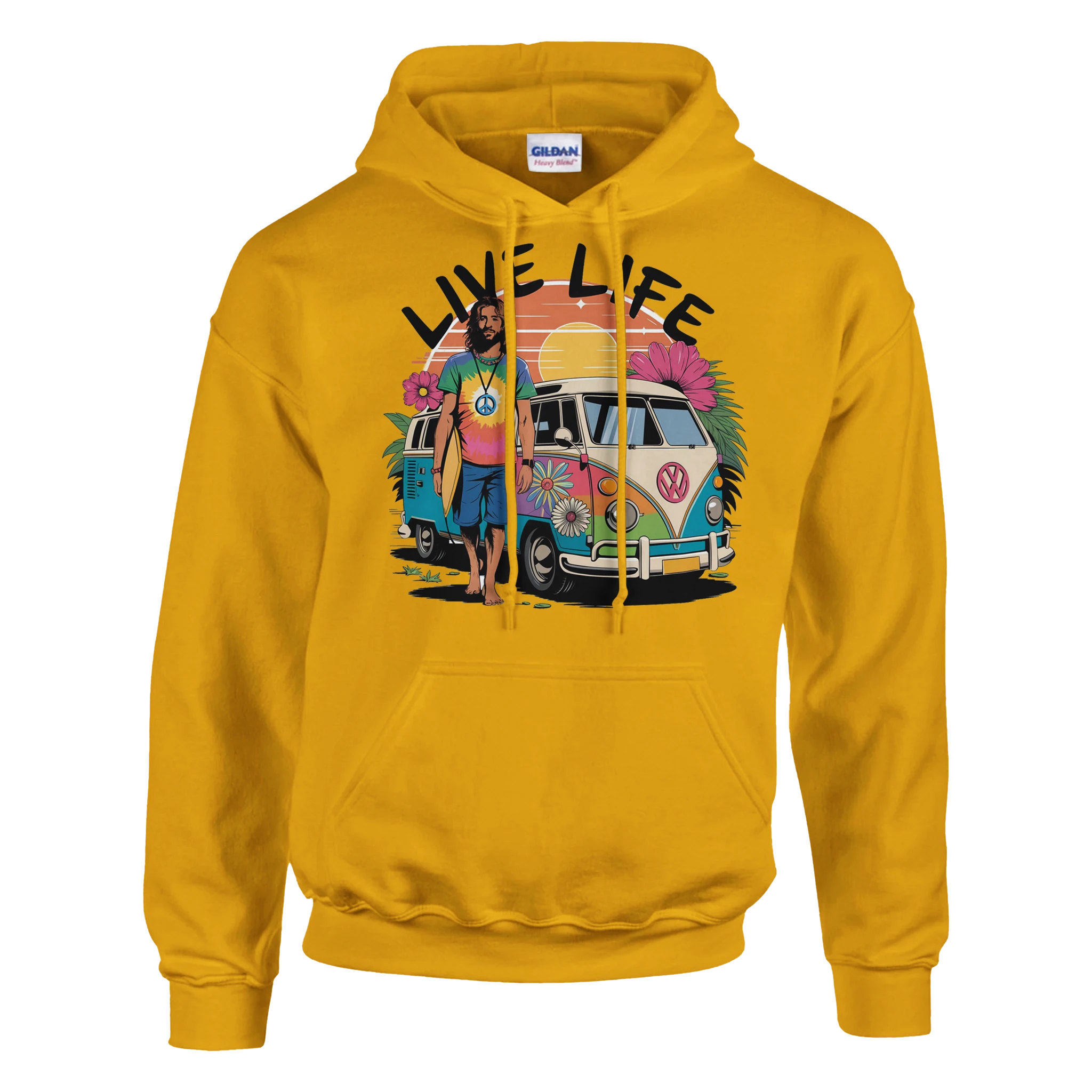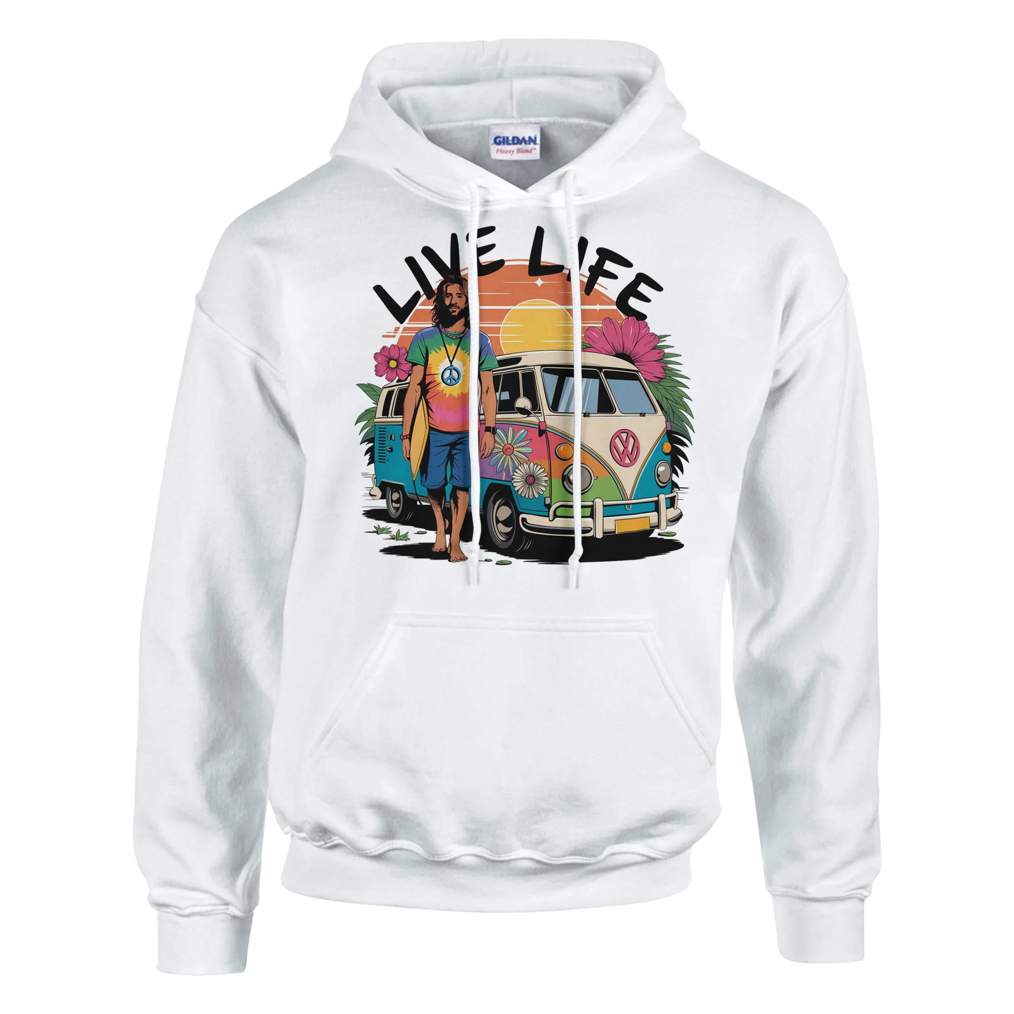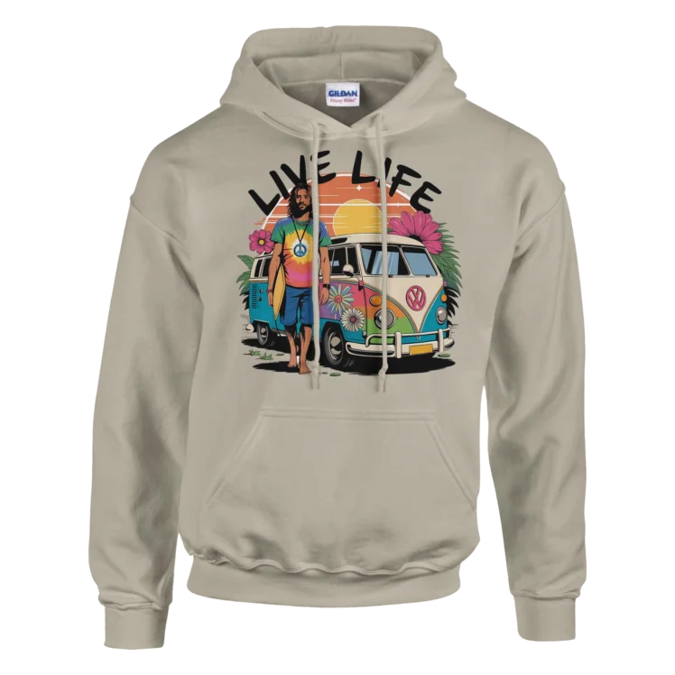 Imagina una furgoneta camper vibrante, pintada con colores llamativos. En un lado, un hombre surfero, con su tabla bajo el brazo y una sonrisa radiante, se apoya despreocupadamente en la furgoneta, listo para la próxima aventura. El diseño captura la esencia de la libertad y la diversión, mientras que en letras grandes y audaces se lee “Live Life”, recordándonos que cada día es una oportunidad para disfrutar y explorar.